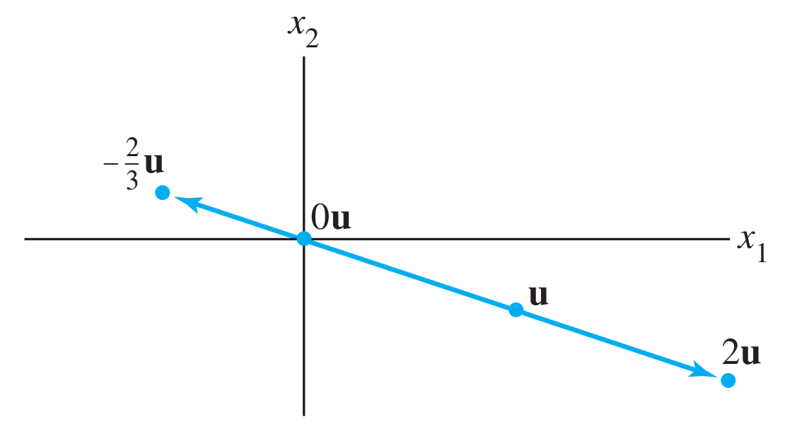 벡터 u의 특정 스칼라 곱은 좌측 그래프의 점처럼 표현될 수 있으며 벡터 u의 모든 스칼라곱 집합은 직선으로 표현된다.